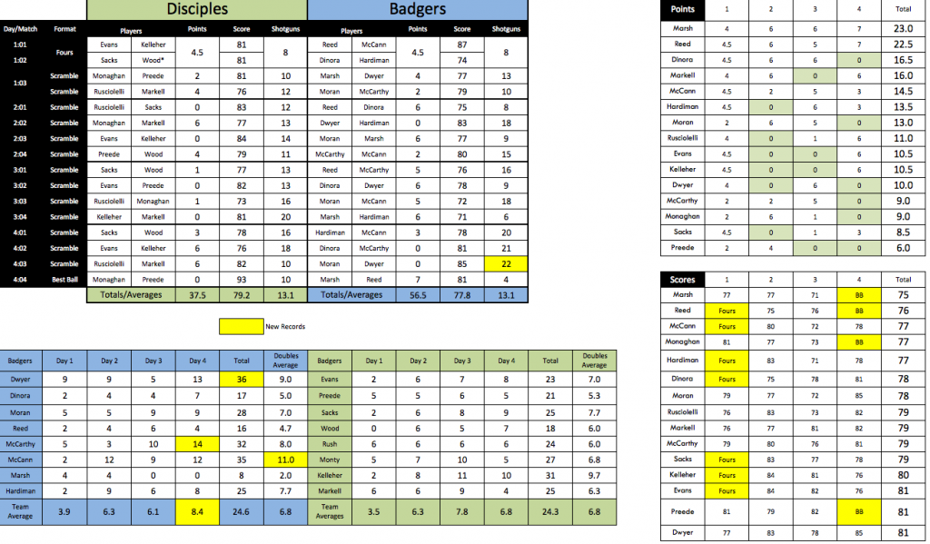 The Badgers were led by veteran Danny Marsh who returned with a vengeance from a one-year Myrtle hiatus. Marsh won all four of his matches and only lost two points all weekend. Strong play from rookies Brian Reed and Mark Dinora also contributed greatly to the team victory. In defeat, the Disciples got strong performances from Wood, Markell and Sacks but lacked consistency elsewhere.