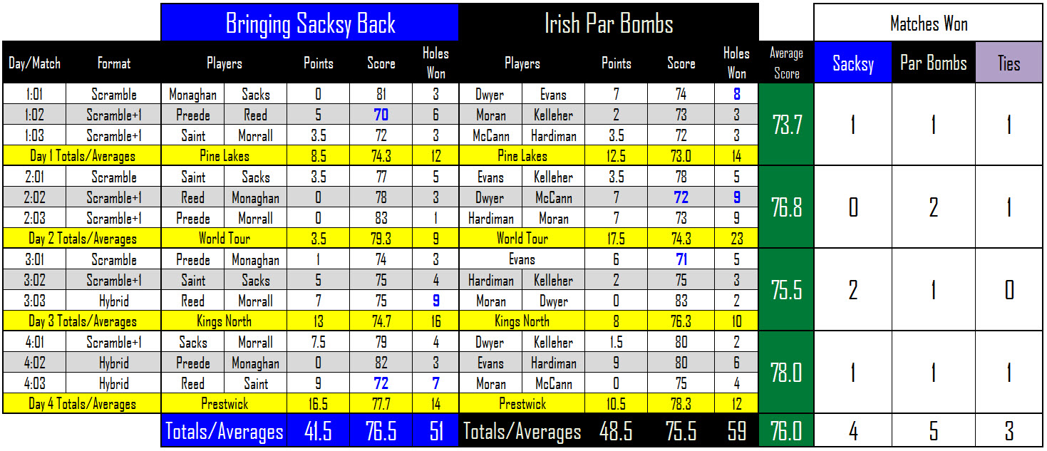 Riding a strong performance on Day 2, the Irish Par Bombs hold on to defeat Bringing Sacksy Back 48.5 – 41.5 in the 14th Annual Myrtle Mayhem.
