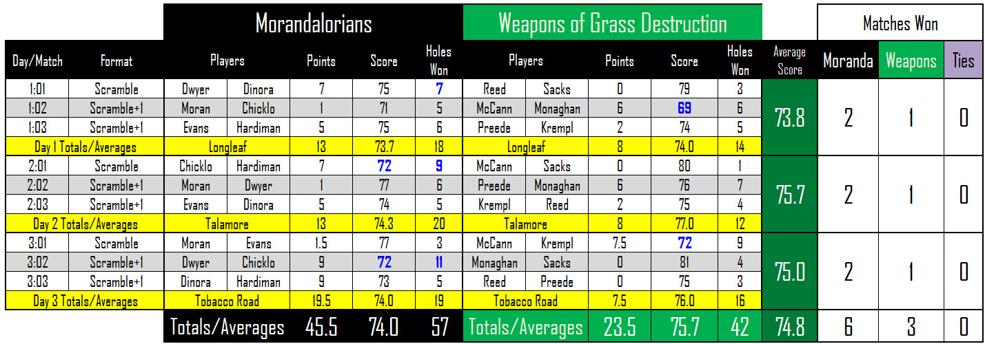 The Morandalorians won each of the three days to capture the crown at the first ever Pinehurst event. After COVID-19 forced the cancellation of the 2020 Myrtle Mayhem, the event was rescheduled for Pinehurst in September.