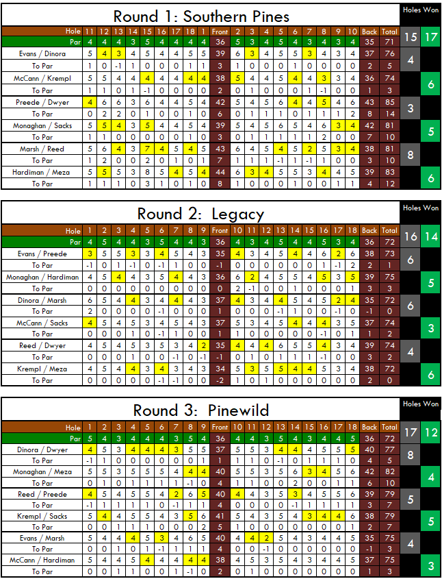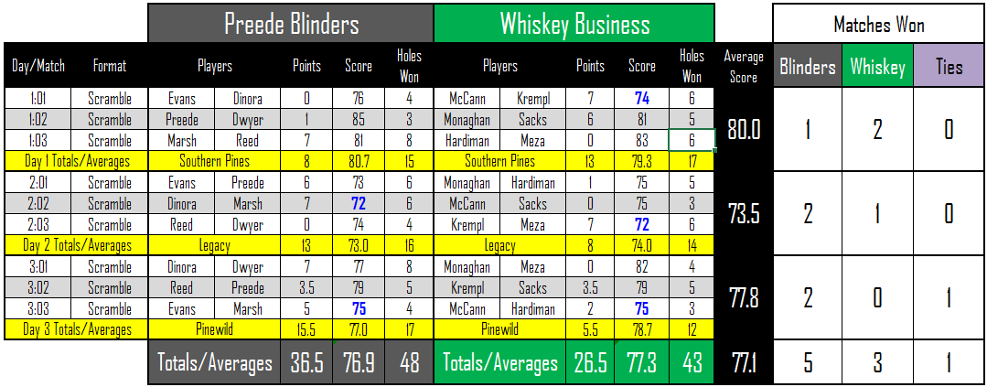 For the second straight event, the competition was tied after 2 days. But the Blinders went 2-0-1 in the three Saturday matches to win the second Pinehurst Pandemonium. Team Whiskey Business was led by an undefeated Krempl (2-0-1).