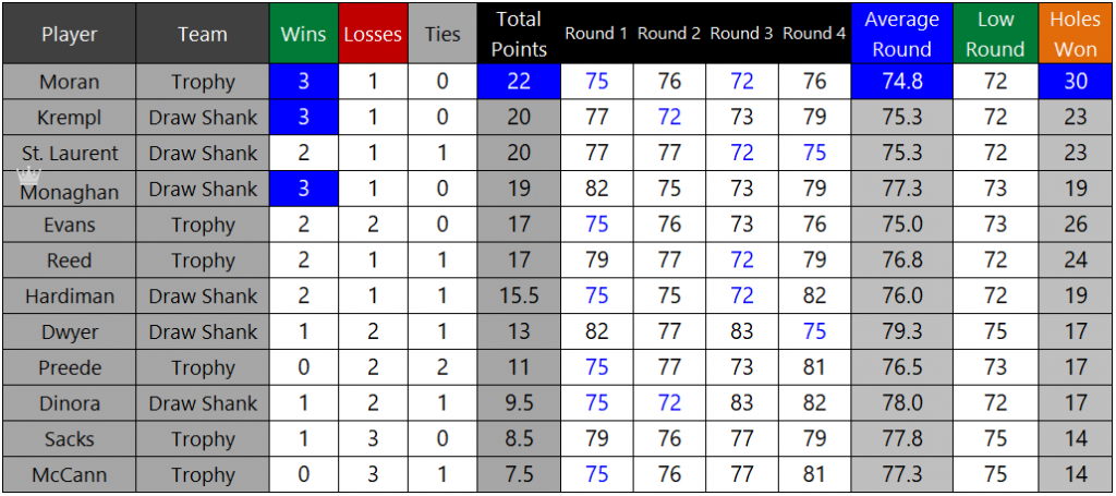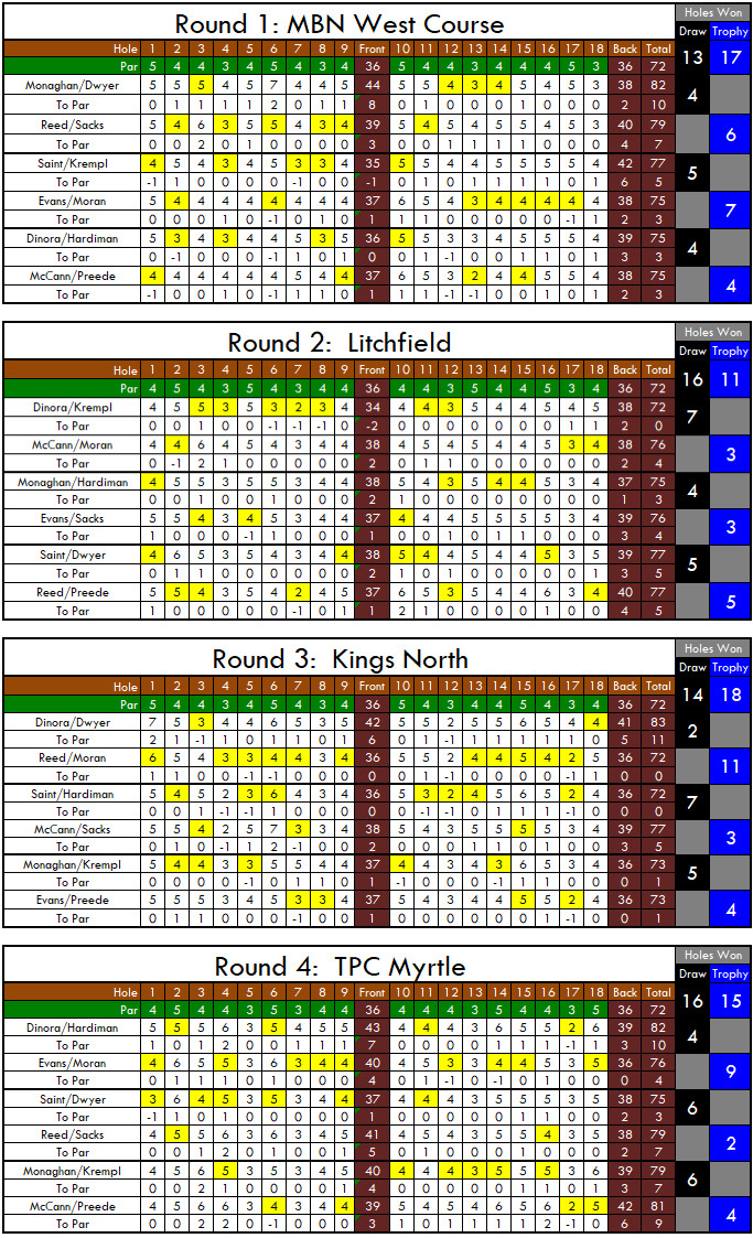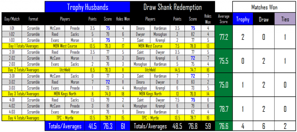 DrawShank Redemption came back from a day 1 deficit to win days 2 and 3, and then held off the Trophy Husbands to secure a 7-point victory in the 2024 Myrtle Mayhem