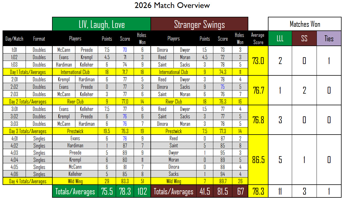 - With the event tied after two days, LIV, Laugh, Love proceeded to win 8 of the remaining 9 matches.
